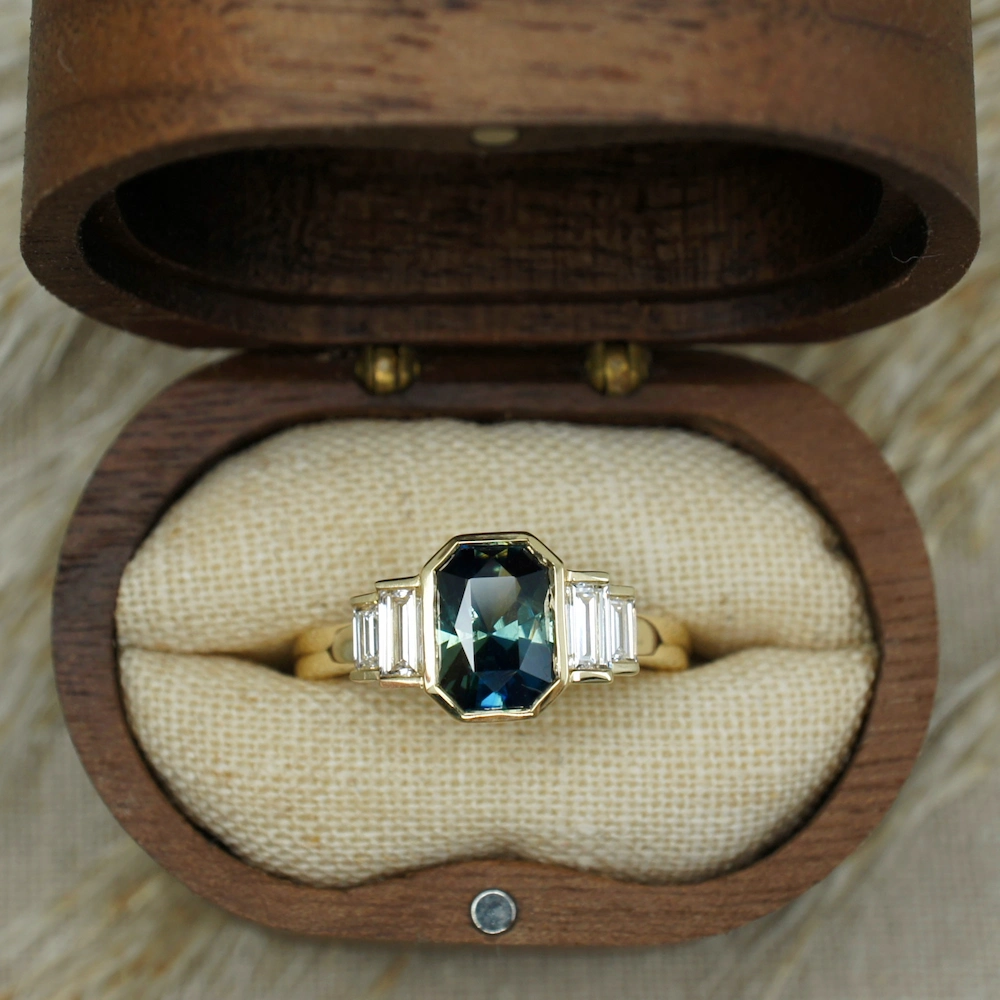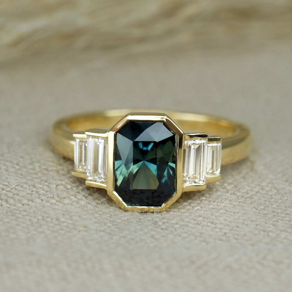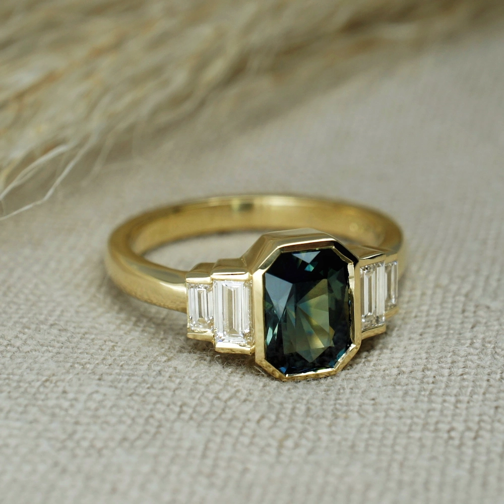 Bi colour sapphire and baguette diamond engagement ring