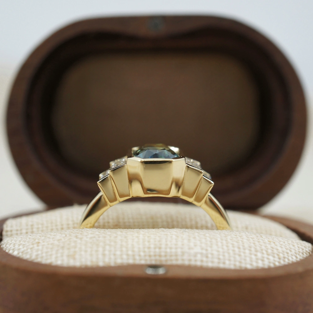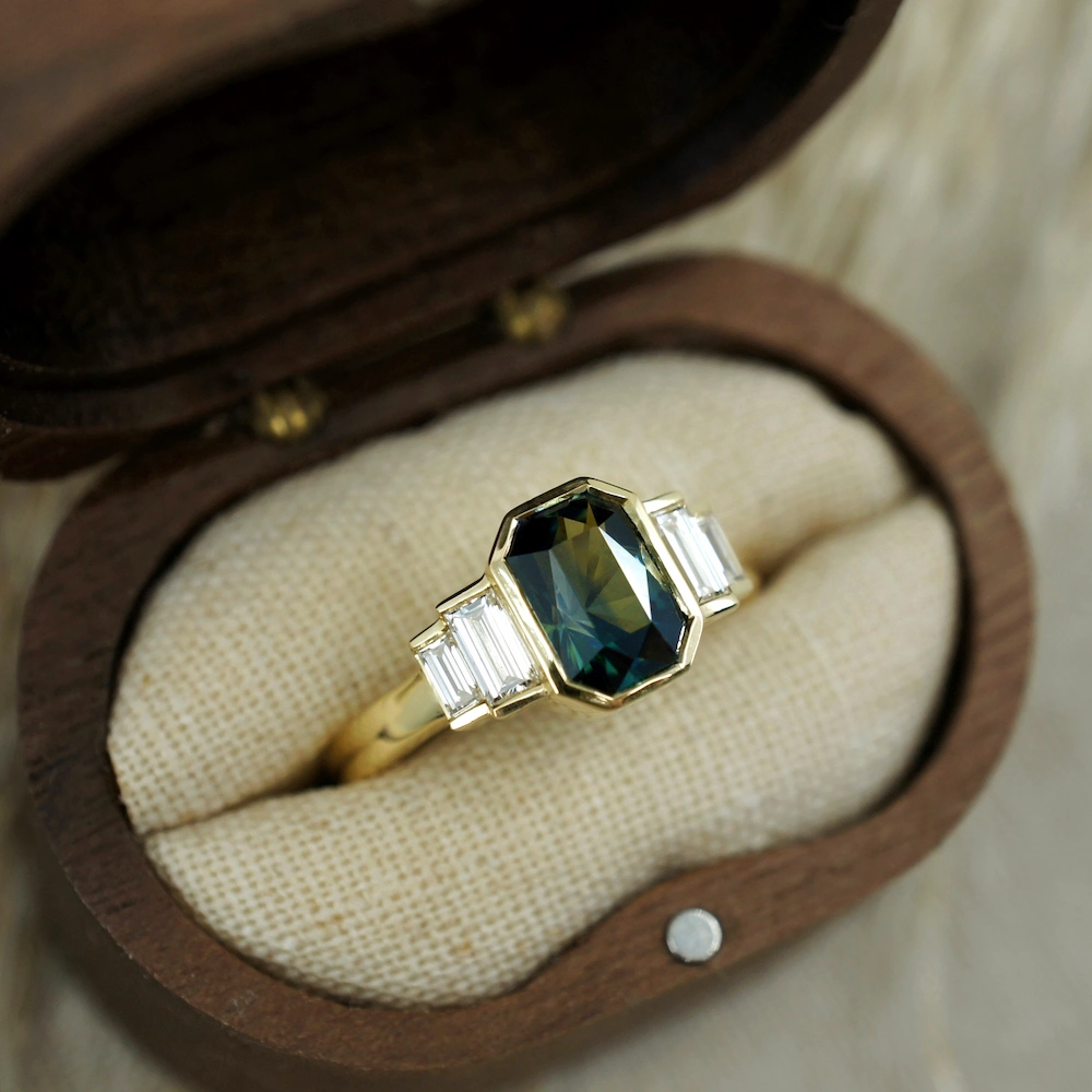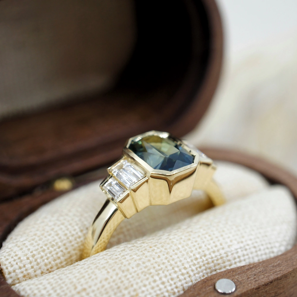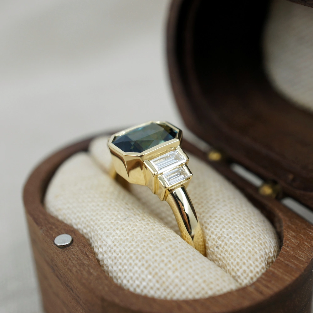 Bi colour sapphire and baguette diamond engagement ring