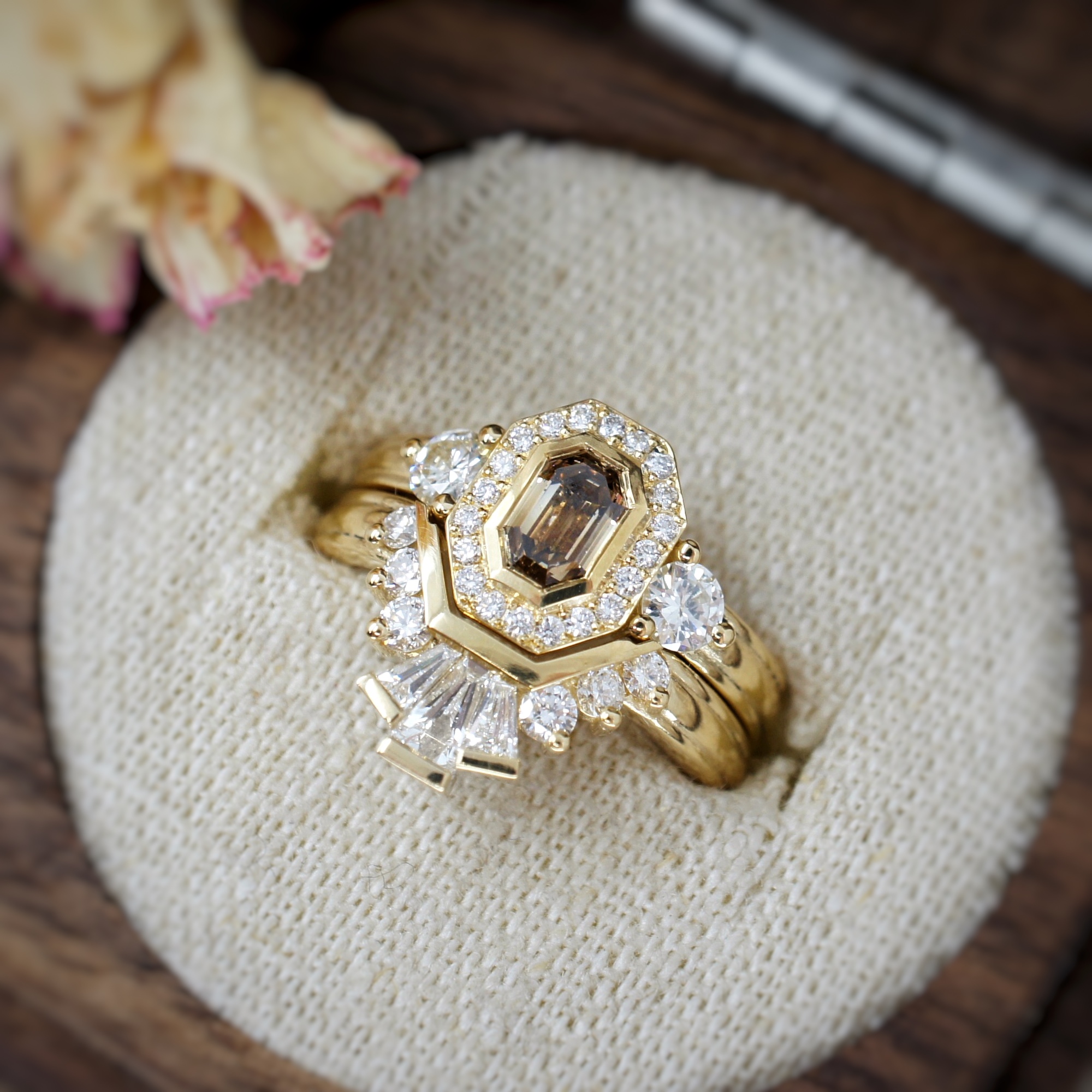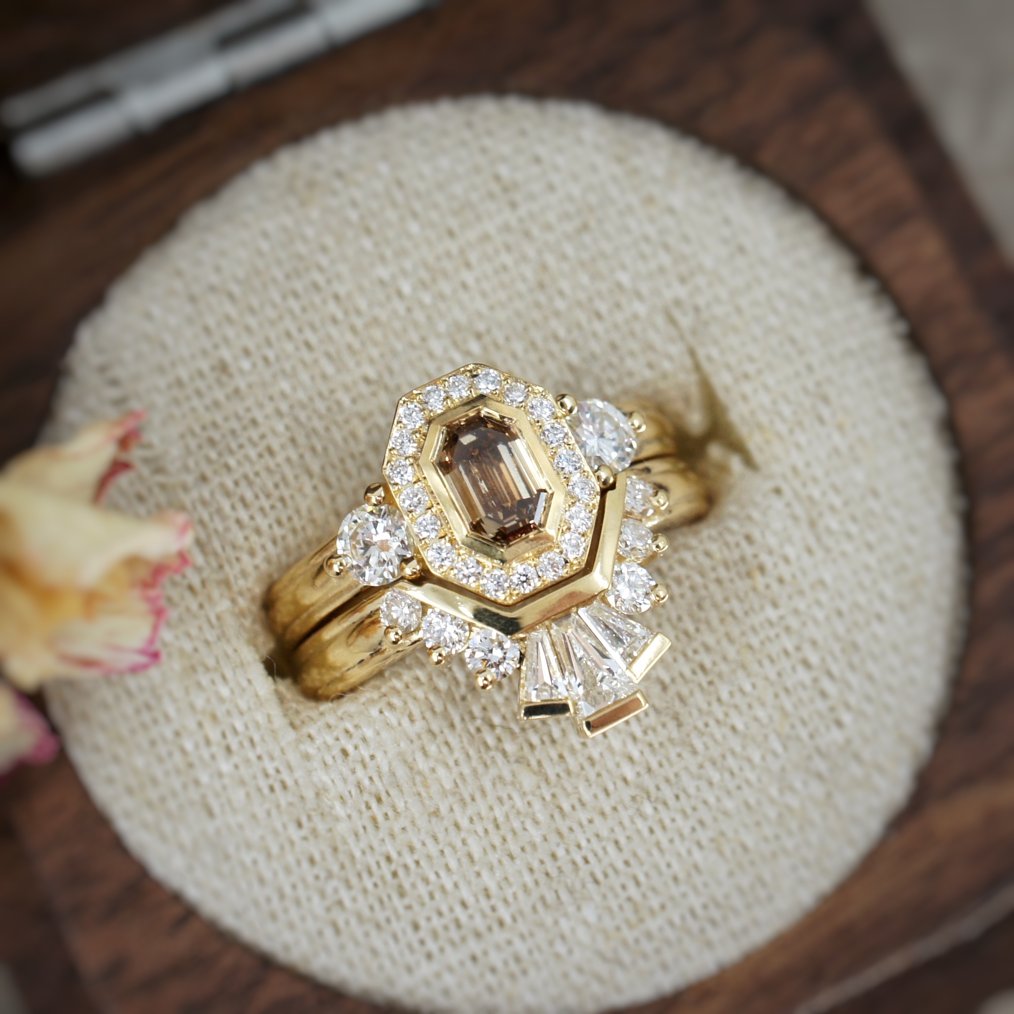 Cognac diamond halo engagement ring and wedding ring set