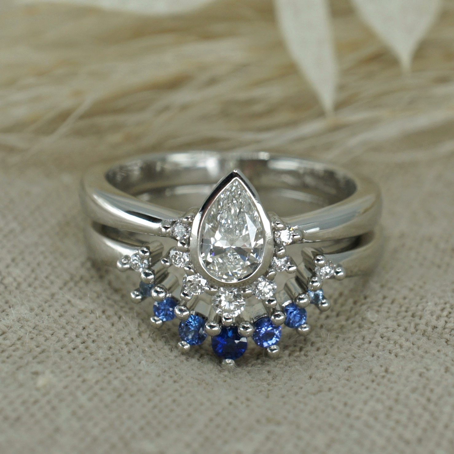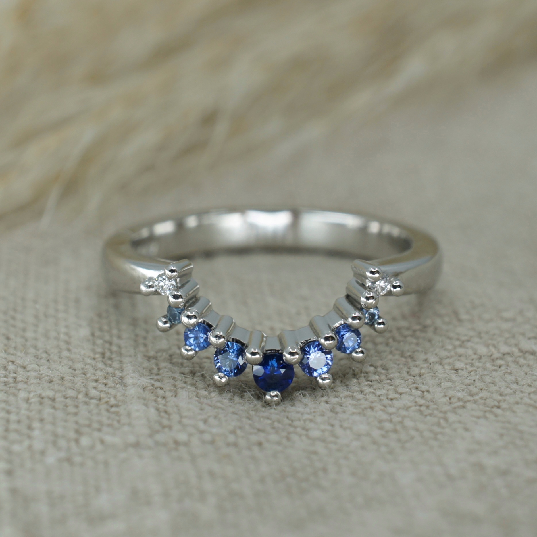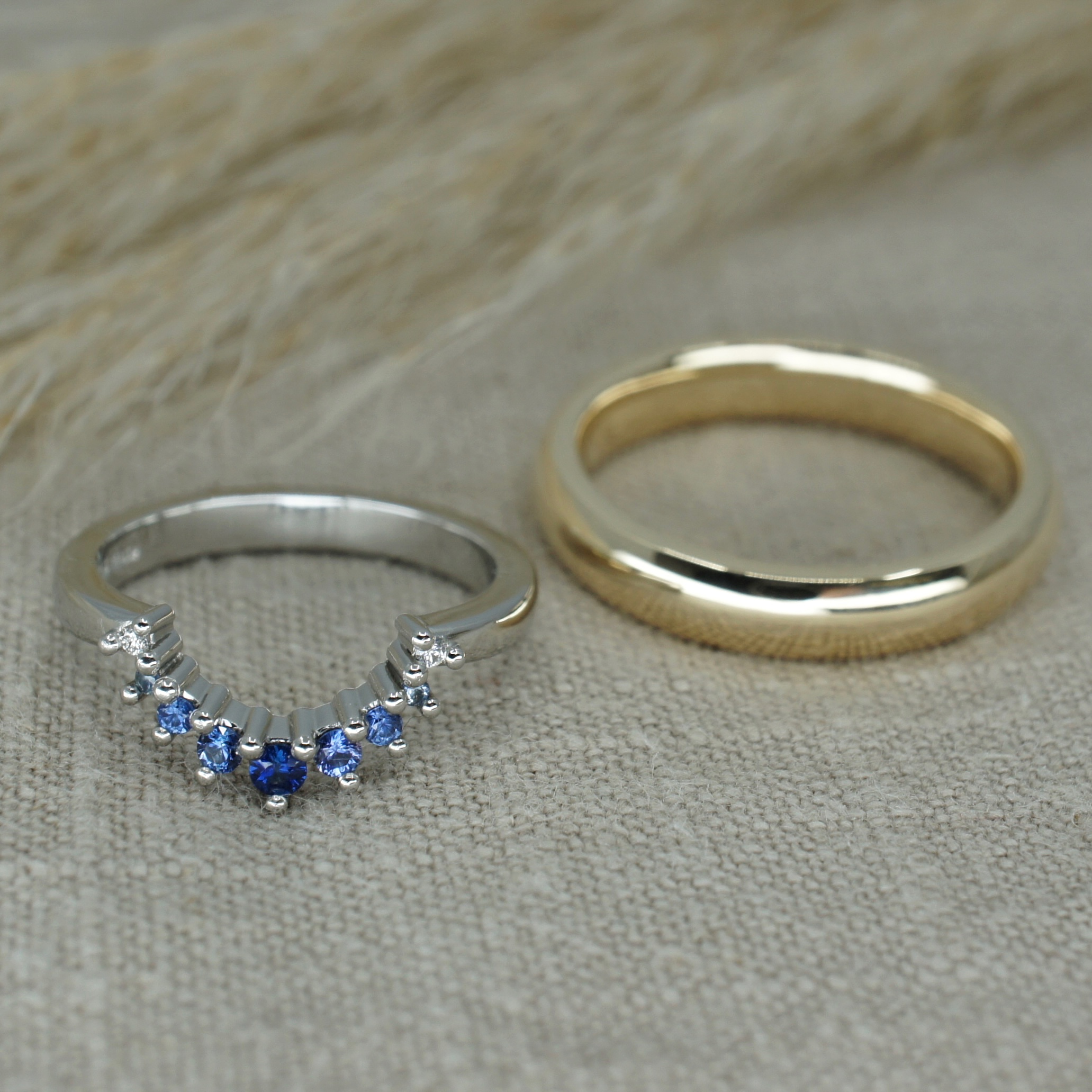 Graduating blue sapphire and diamond shaped wedding ring and gold wedding band