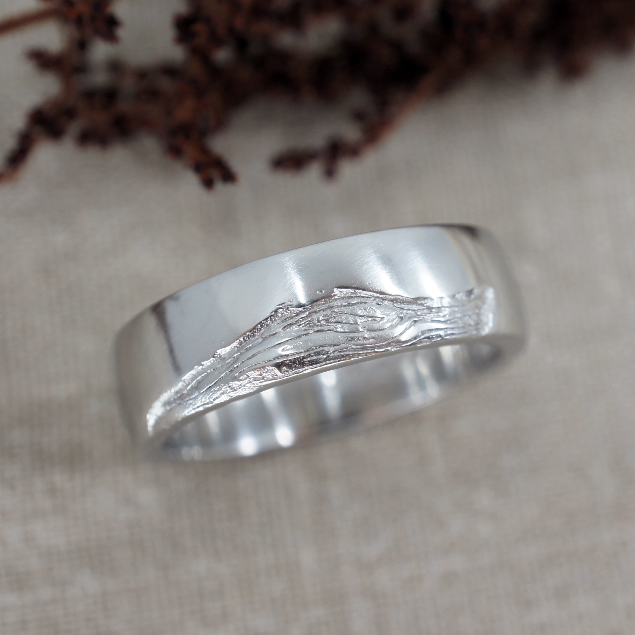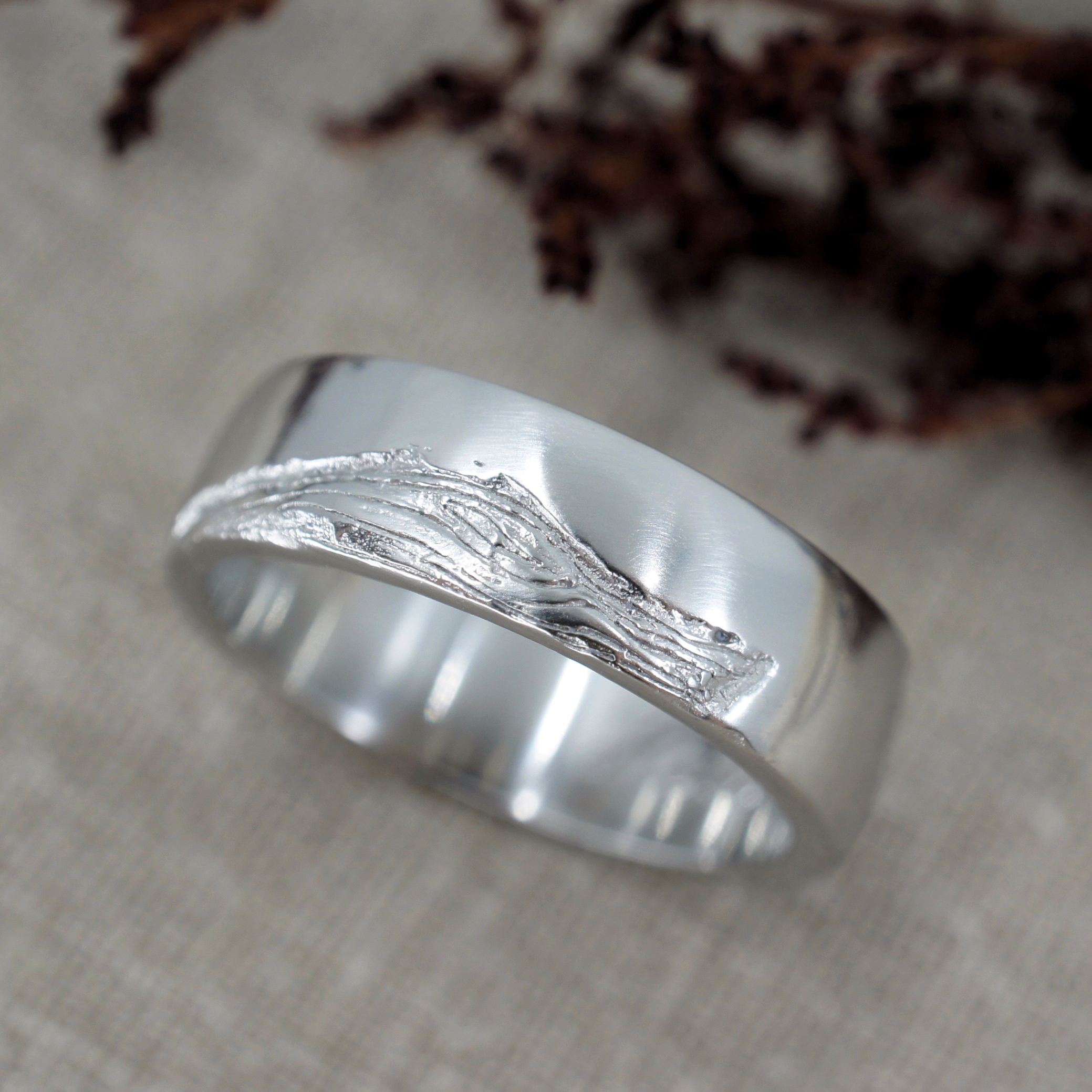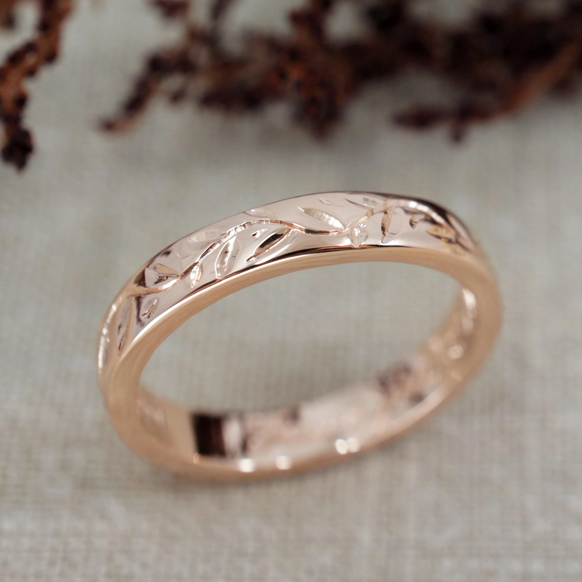 Vine engraved rose gold ring and platinum wood texture wedding ring